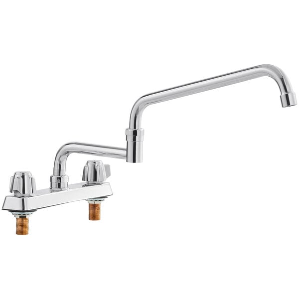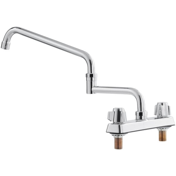 This Regency deck mount faucet with 18″ double-jointed spout is an excellent choice when you need a reliable, affordable water fixture for your facility! Designed to be easy to install and easy to maintain, it’s easy to see why Regency faucets are a great solution for any business. Thanks to a 18″ long double-jointed spout, this faucet delivers water exactly where you need it, and the hinged design gives maximum flexibility to fill multi-compartment sinks, while also letting you fold it out of the way when it’s not being used. This is especially useful when you need to wash large and bulky cooking vessels. Water exits the faucet through a 2 GPM aerator, which creates a soft flow pattern with minimal splashing. The faucet installs on your sink deck or countertop on a pair of 8″ centers and connects to the facility water lines with a set of 1/2″ NPS inlets. The faucet body is made from chrome-plated brass that complements nearly any design aesthetic, and the water flow is controlled by a pair of simple lever handles. Overall Dimensions: Spout Length: 18″ Faucet Height: 10 5/8″