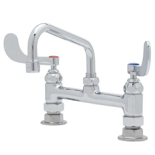 This T&S B-0221-CR4-L22 deck mounted pantry faucet is the perfect solution when you need a reliable water fixture in your facility. It boasts 8″ adjustable centers while its 12″ swing spout and 2.2 GPM laminar flow device deliver gentle water flow that’s ideal for multiple applications. Additionally, this faucet is engineered for maximum durability and uses Cerama cartridges to adjust the temperature and flow rate. These cartridges contain ceramic discs that form a long-lasting water tight seal. When the wrist handles of this faucet are turned, the discs spin to allow water to pass through. T&S cartridges are designed with efficiency and convenience in mind, allowing you to swap out one piece in the event of a leak, instead of replacing multiple moving parts.