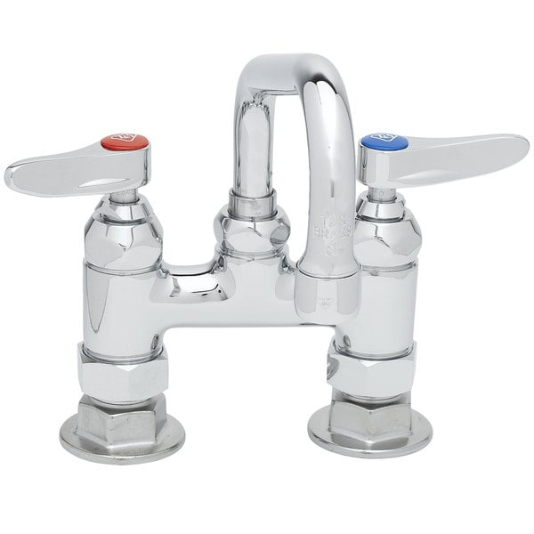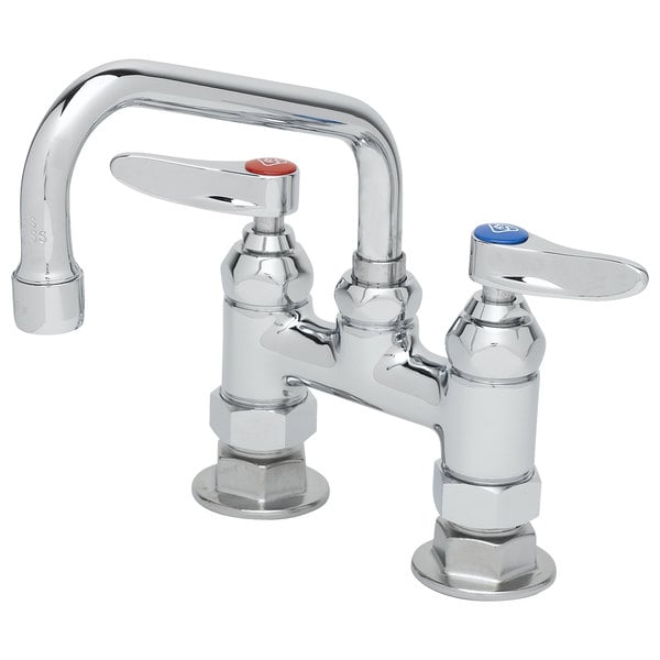 This T&S B-0228-CR deck mount faucet features a swing nozzle with a 6″ spread, and its B-PT stream regulator outlet enables consistent, even water flow. The specialized Cerama cartridges are made of ceramic to help stand up to heavy use, while the cartridge exterior is made of brass to withstand temperatures up to 195 degrees Fahrenheit. The faucet has 1/2″ NPT female connections and sits on 4″ adjustable centers.