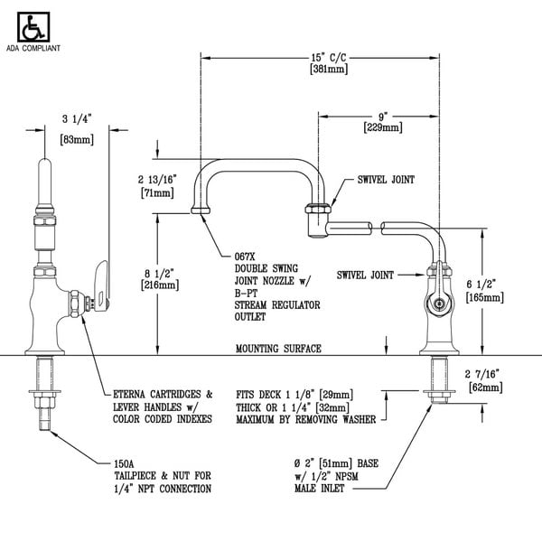 Install a convenient and useful water fixture in your business with the T&S B-0256 single hole deck mount pantry faucet! This faucet features a single supply inlet with a tailpiece for fast and easy installation. Its 15″ double joint nozzle provides excellent water flow while allowing convenient positioning, and the Eterna cartridges ensure outstanding compression.