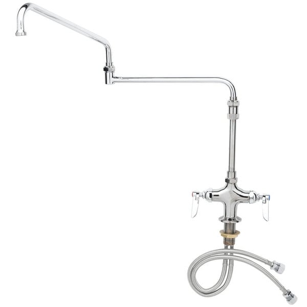 This T&S B-0268-01 deck mounted single hole pantry faucet features an 18″ long double-jointed swing nozzle that lets you move water exactly where you need it, with a stream regulator outlet to provide you with faster water flow and minimal backsplash. To make installation easy, it also boasts 1/2″ NPT male inlets on 18″ flexible connector hoses. Removable compression fittings for 5/8″ copper tubing are provided. A simple lever handle design with color-coded indexes makes it easy to turn the water on and off as needed, and will stand up to plenty of use over time. Additionally, Eterna compression cartridges provide excellent durability thanks to a solid brass spindle and body, and also make this faucet great for a variety of applications. This faucet also includes a 4 5/8″ straight swivel extension to give additional clearance for particularly large items.